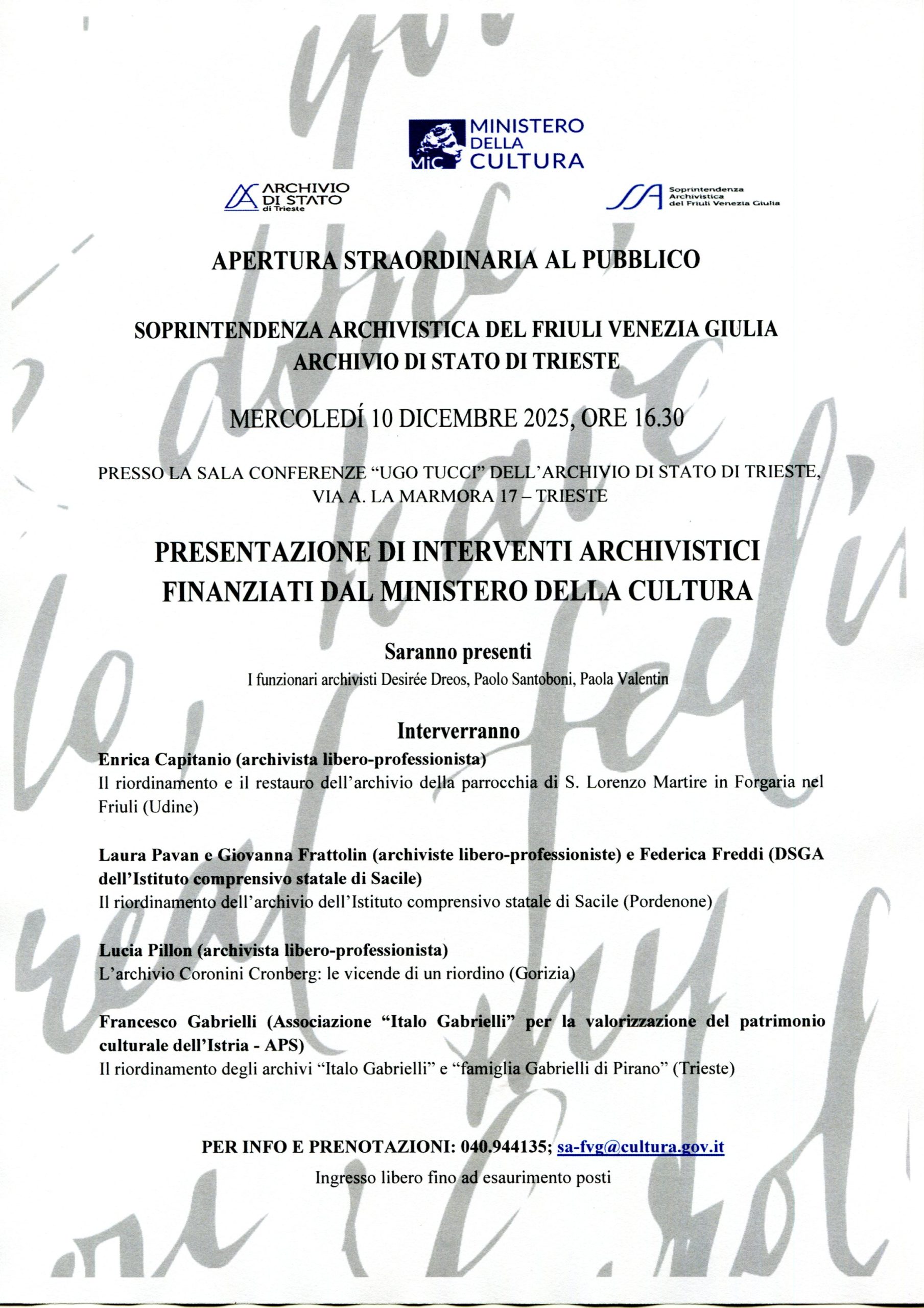 Mercoledì 10 dicembre 2025 alle 16.30, presso la sala conferenze “Ugo Tucci” dell’Archivio di Stato di Trieste in via La Marmora 17 a Trieste, saranno presentati gli interventi archivistici finanziati dal Ministero della Cultura.