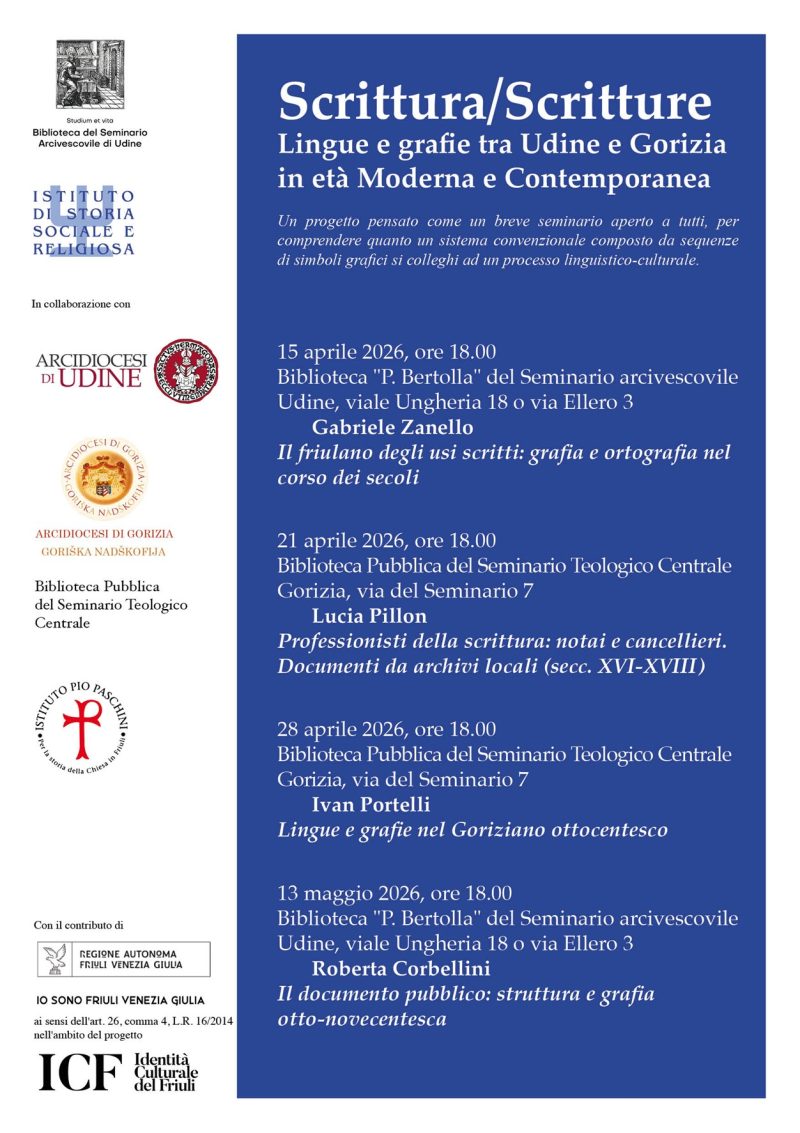 Il corso rientra nel progetto annuale di collaborazione tra Biblioteca del Seminario di Udine e Istituto di Storia Sociale e Religiosa di Gorizia, in sinergia con le istituzioni delle arcidiocesi di Gorizia e di Udine, per scoprire e approfondire in modo semplice e diretto l’affascinante e complesso mondo degli archivi e della scrittura. Vedrà 4 incontri pratici, tra Udine e Gorizia, per imparare a muoversi negli archivi moderni, capire la storia e l’evoluzione delle loro scritture, con un interesse orientato al nostro territorio.